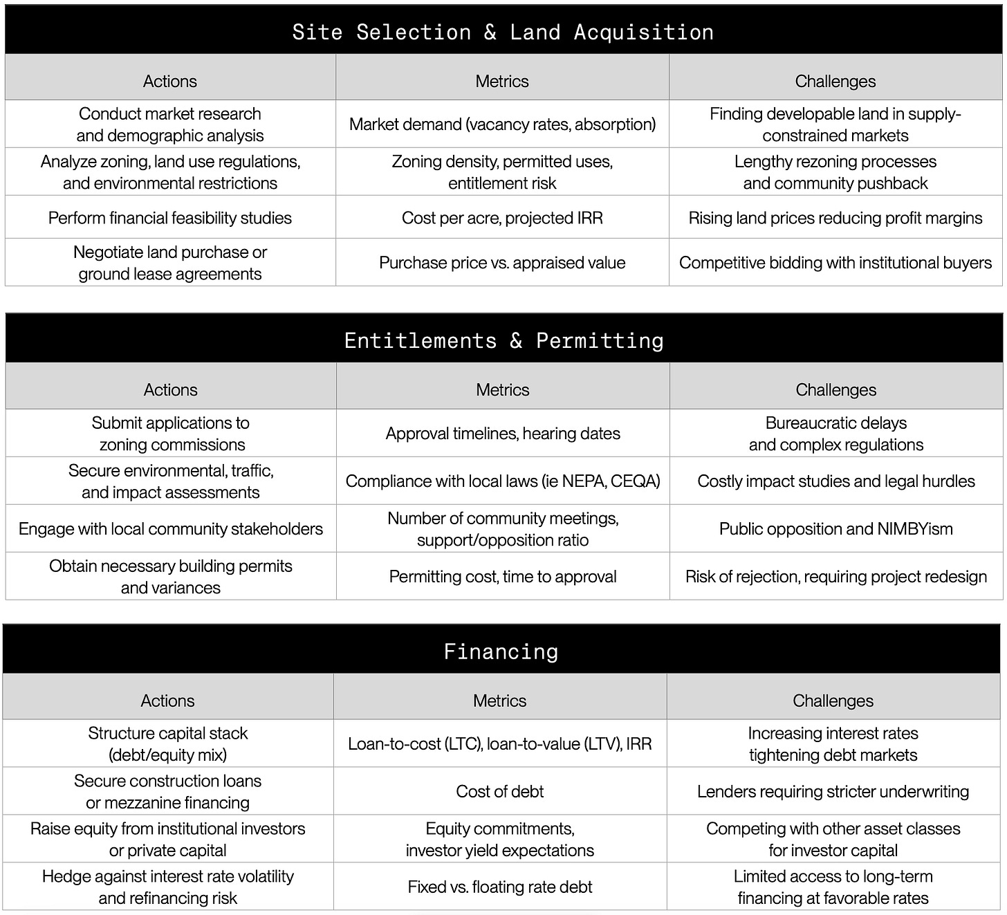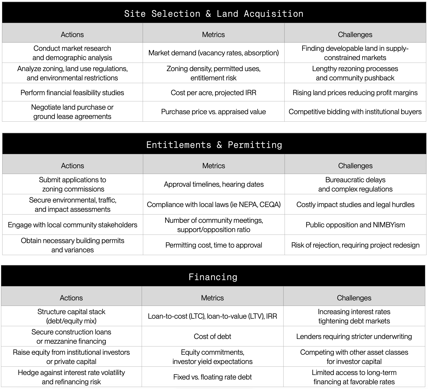 The planning phase involves obtaining entitlements (permits, zoning approvals, environmental clearances) and designing the property. This is a bureaucratic bottleneck in many markets, as regulatory approvals can take years, significantly impacting project timelines.