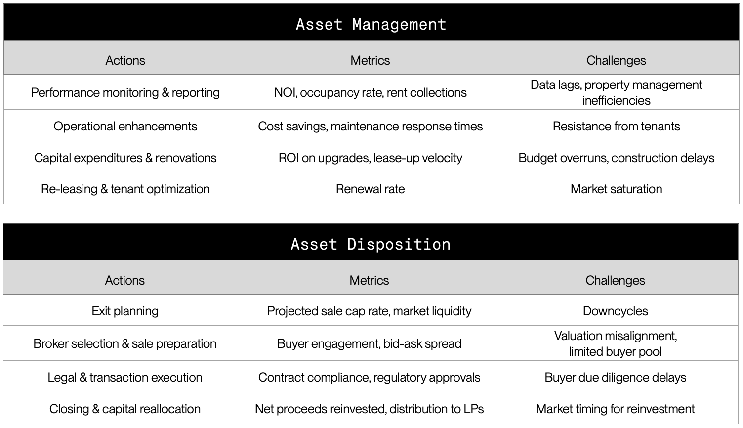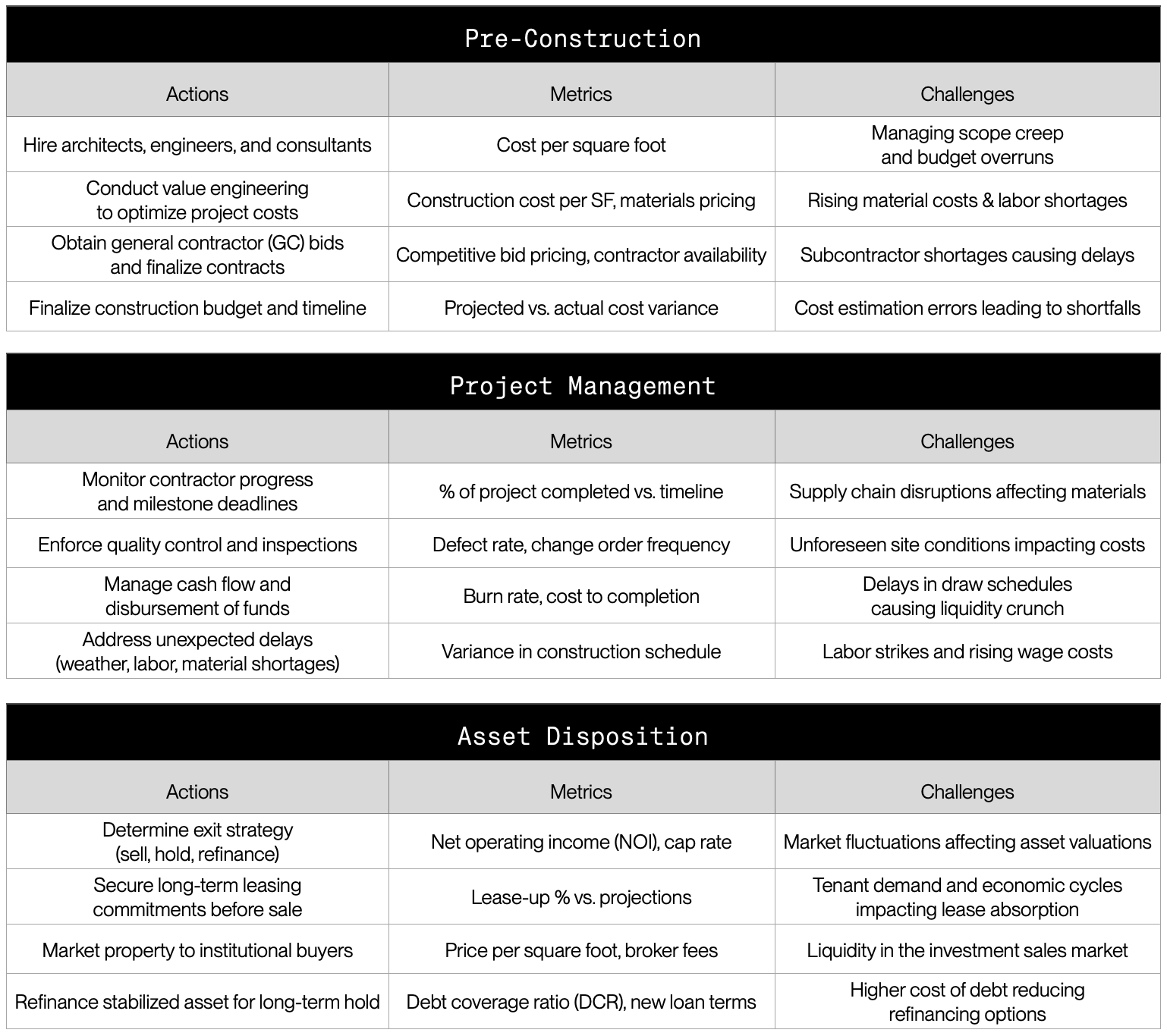 Once a property is built, it must be leased, sold, or managed to generate returns. Investors focus on occupancy rates, rental income, and asset appreciation to achieve desired returns.