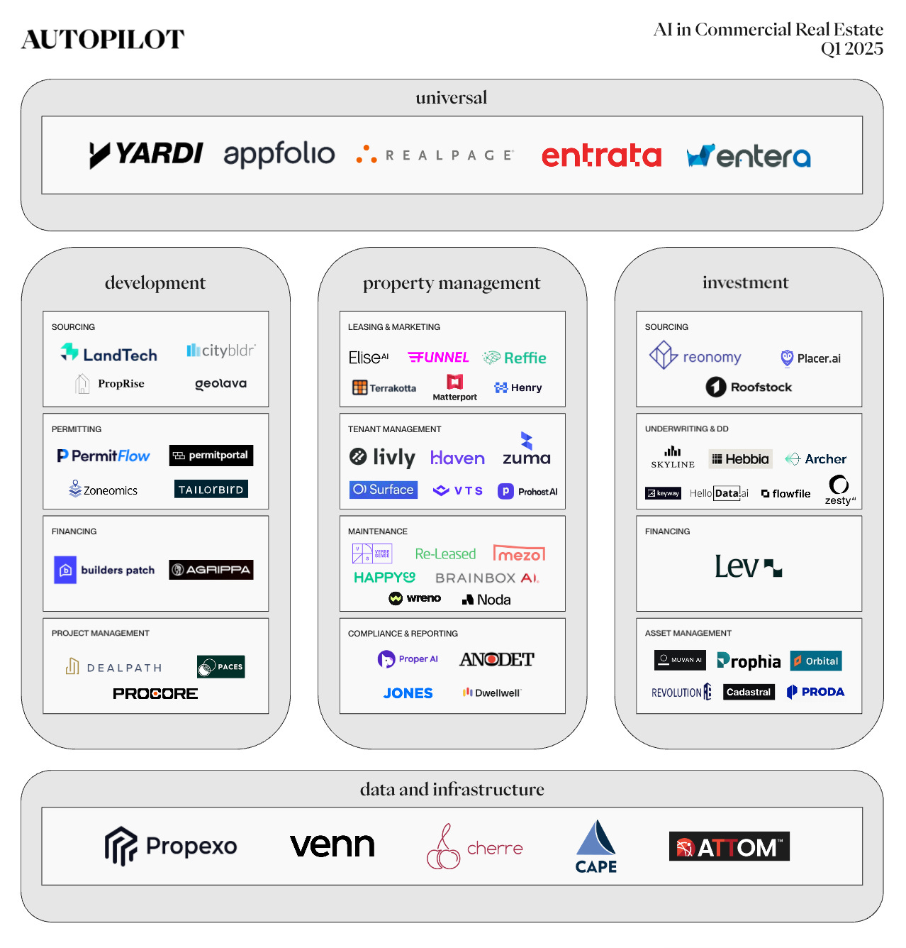 In our research, we analyzed over 100 companies, including emerging proptech startups and industry giants like Appfolio and Realpage, which have expanded their AI capabilities through acquisitions and in-house development. From AI-powered underwriting to autonomous leasing assistants and predictive maintenance systems, these companies are redefining how real estate is managed and transacted.