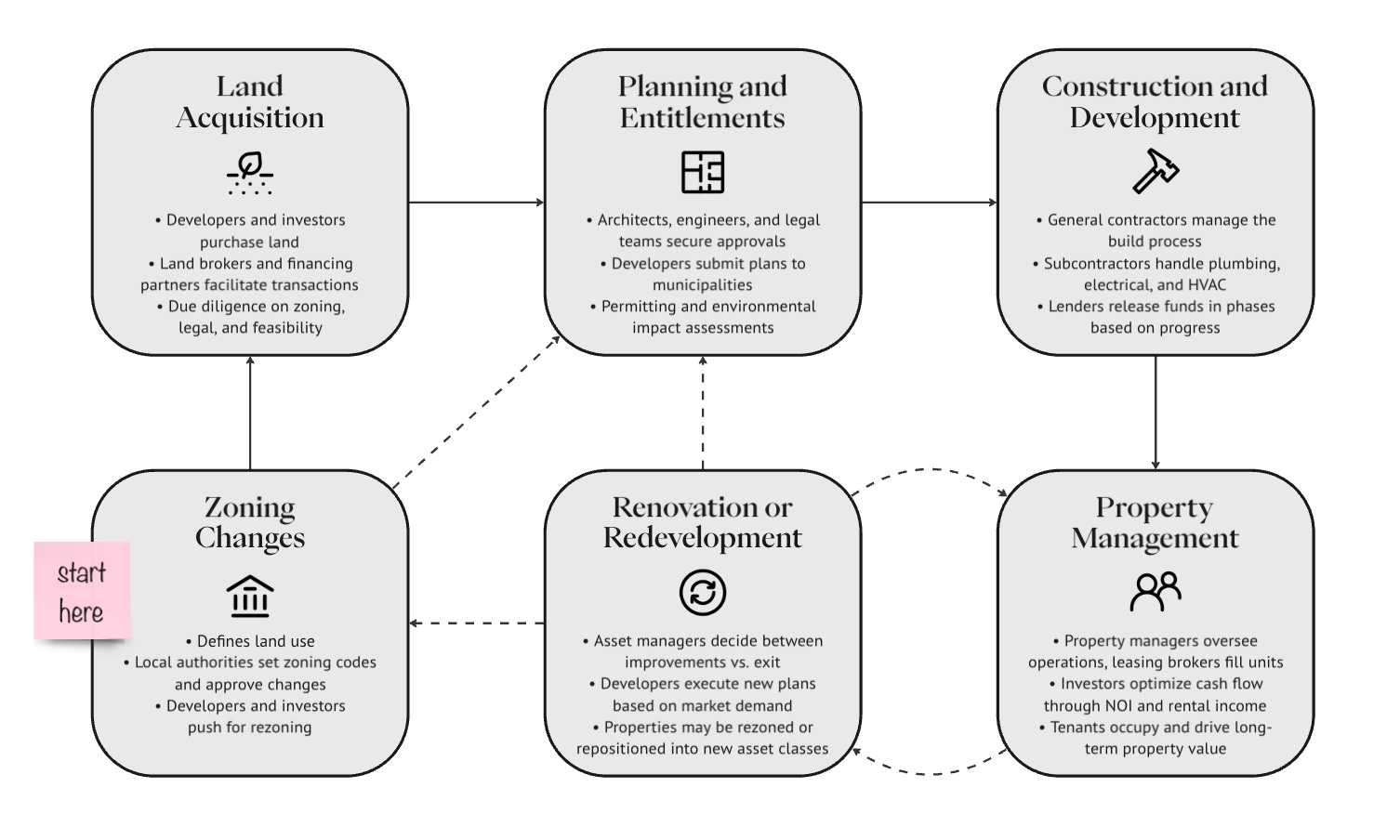 Commercial real estate is a complex, slow-moving industry with long development timelines, fragmented operations, and heavy reliance on manual processes. Projects involve multiple stakeholders - governments, developers, lenders, contractors, property managers, and investors. Each of these groups have different priorities, creating inefficiencies at every stage.